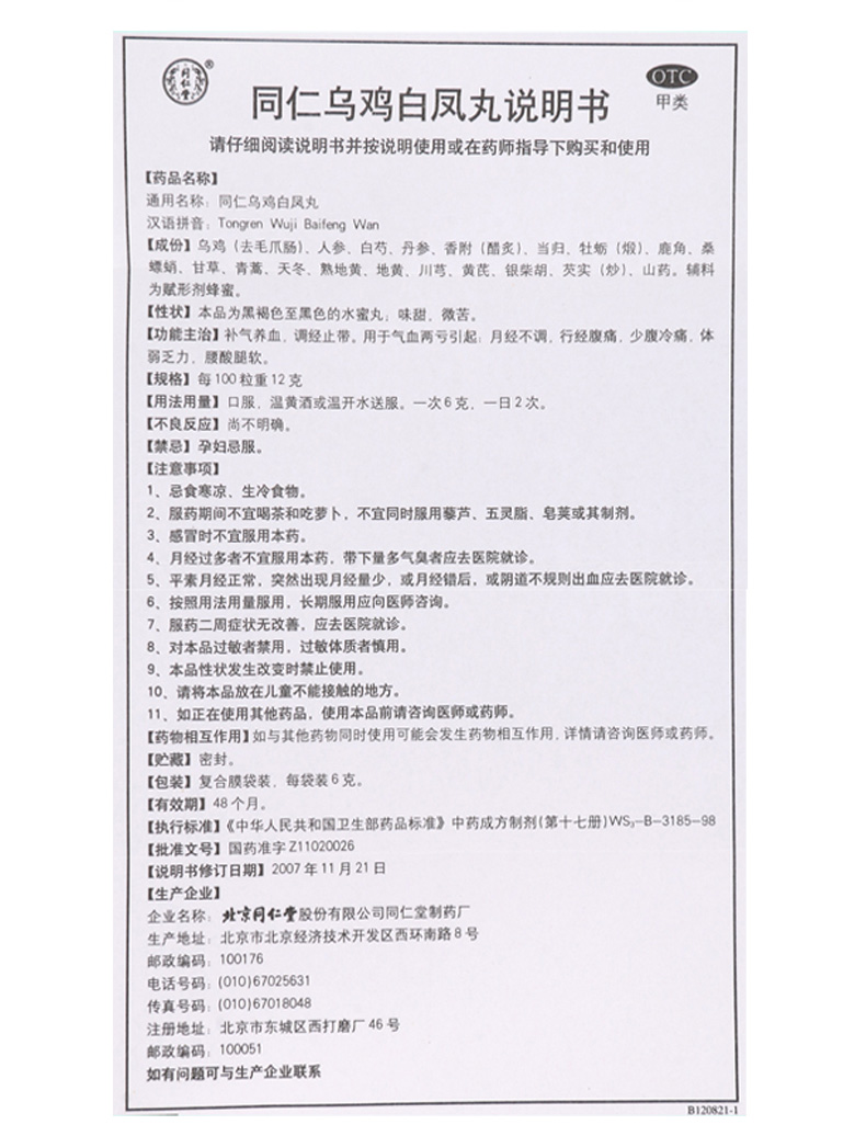 【注意事项】1.忌食寒凉、生冷食物。2.服同仁乌鸡白凤丸期间不宜喝茶和吃萝卜,不宜同时服用藜芦、五灵脂、皂荚或其制剂。3.感冒时不宜服用本药。4.月经过多者不宜服用本药,带下量多气臭者应去医院就诊。5.平素月经正常,突然出现月经量少,或月经错后,或阴道不规则出血应去医院就诊。6.按照用法用量服用,长期服用应向医师咨询。7.服药二周症状无改善,应去医院就诊。8.对本品过敏者禁用,过敏体质者慎用。9.本品性状发生改变时禁止使用。10.请将本品放在儿童不能接触的地方。11.如正在使用其他药品,使用同仁乌鸡白凤丸前请咨询医师或药师。