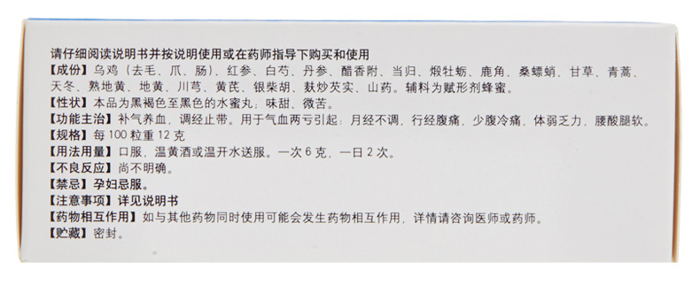 【主要成份】乌鸡(去毛爪肠)、人参、白芍、丹参、香附(醋炙)、当归、牡蛎(煅)、鹿角、桑螵蛸、甘草、青蒿、天冬、熟地黄、地黄、川芎、黄芪、银柴胡、芡实(炒)、山药。辅料为赋形剂蜂蜜。
