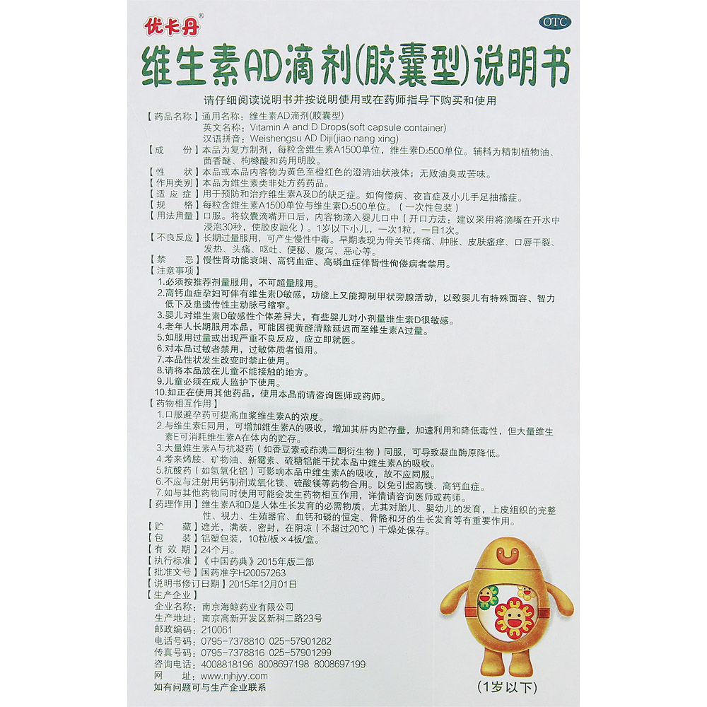 【注意事项】1.维生素AD滴剂必须按推荐剂量服用,不可超量服用。2.高钙血症孕妇可伴有维生素D敏感,功能上又能抑制甲状旁腺活动,以致婴儿有特殊面容、智力低下及患遗传性主动脉弓缩窄。3.婴儿对维生素D敏感性个体差异大,有些婴儿对小剂量维生素D很敏感。4.老年人长期服用本品,可能因视黄醛清除延迟而至维生素A过量。5.如服用过量或出现严重不良反应,应立即就医。6.对本品过敏者禁用,过敏体质者慎用。7.本品性状发生改变时禁止使用。8.请将本品放在儿童不能接触的地方。9.儿童必须在成人监护下使用。10.如正在使用其他药品,使用本品前请咨询医师或药师。